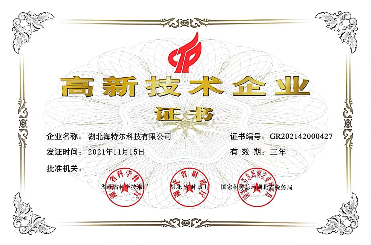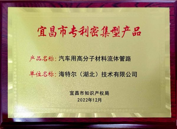 海特尔(湖北)技术有限公司近年来持续加大汽车用高分子材料流体管路新产品的研发,在内氟外硅胶管、内丙外硅胶管、CM胶管、氢燃料电池用胶管、纯电池与氢燃料电池橡胶密封制品等方面取得突破,并取得了32项各类专利与2项软著,有效地保护公司相关知识产权。汽车用高分子材料流体管路被宜昌市知识产权局授予宜昌市专利密集型产品荣誉称号。